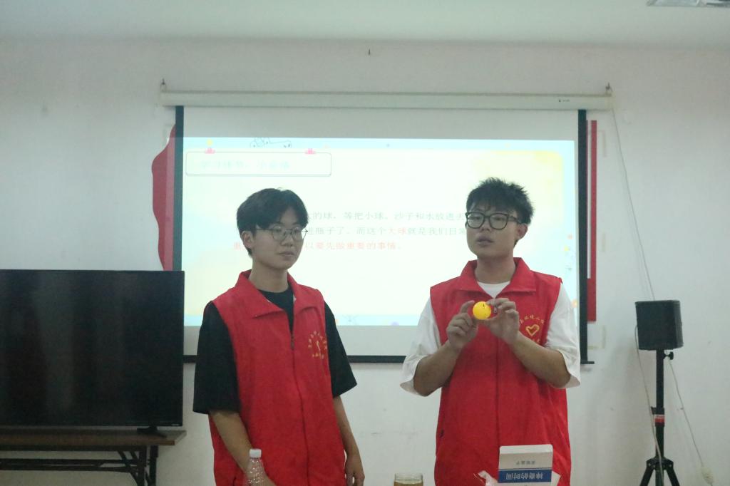 趣味实验部分,志愿者开展谁偷走了我的时间的趣味实验志愿者拿出道具,边讲解边演示,用大球代表大事,小球代表小事,沙子和水代表琐事,我们先装大球,然后再装小球,最后倒入沙子、水,这样瓶子就装满了,一天的时间也就安排好了,但如果我先装沙子和水,那么情况又是怎样呢……”他们通过将道具装进水瓶的顺序和方法给小朋友们讲解了一天之中“大事”是最重要的“小事”是其次,只有大事小事琐事按照顺序完成,时间才会被合理安排的道理。