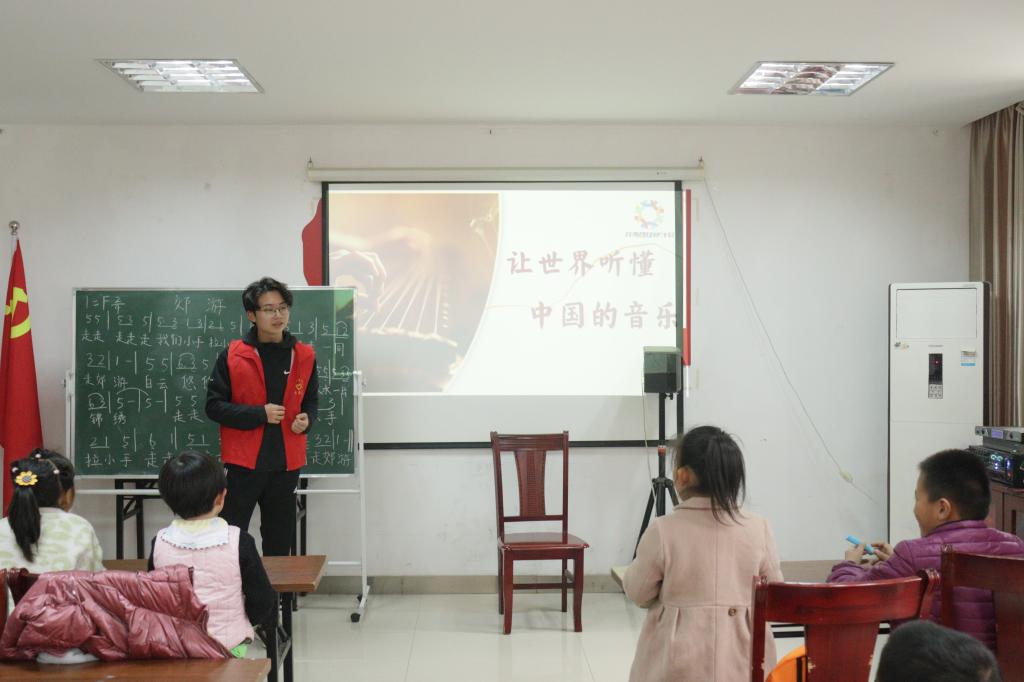 宣讲过程中,志愿者通过PPT上的文字和视频给孩子们讲解中国古典乐器竹笛的故事,让孩子们感受到中国古典音乐的魅力。志愿者们还通过萝卜蹲、击鼓传花等游戏的方式,教孩子们学习儿歌《一起去郊游》,在音乐声中,孩子们同志愿者挥舞双手,一起演唱这首歌曲,场面其乐融融,通过音乐调动孩子们的积极性来激发孩子们对音乐的兴趣,从而培养他们的音乐感和合作精神。
