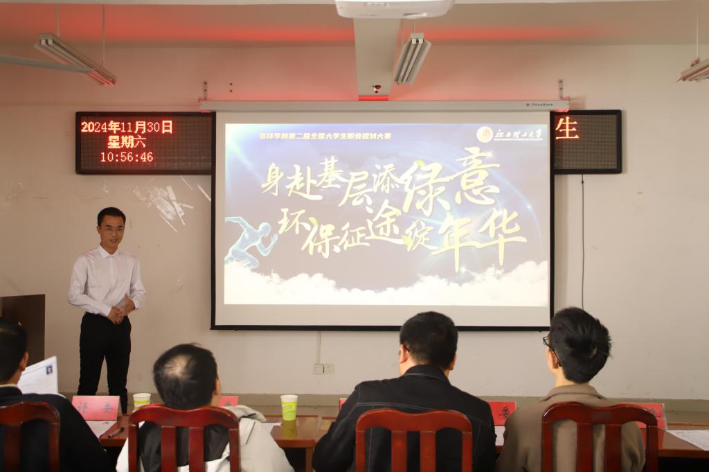 本网讯 11月30日,学院在黄金校区逸夫楼第二会议室举办了第二届大学生职业规划大赛决赛。校招生就业处郭传州和学院辅导员张吉勇、叶景胜、梁颜祯、刘黎明、赖虔德担任比赛评委。本次大赛由环境233班朱定鹏同学主持。