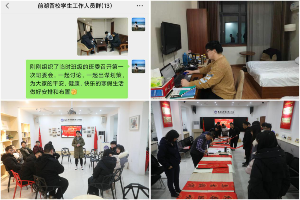 除餐饮、住宿、热水供应等后勤保障方面,学校还组织建立了寒假留校学生“临时班级”,推选班委,选定班长、副班长、学习委员、生活委员、文体委员,编成5个班小组,并为学生发放了书籍和篮球、羽毛球、乒乓球、跳绳等体育用品,在会馆内外设置自习和体育活动场地。相关学院也纷纷响应学校安排,组织教师带领学生进行读书、素质拓展和体育活动。