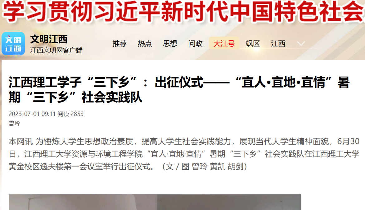 本网讯 为锤炼大学生思想政治素质,提高大学生社会实践能力,展现当代大学生精神面貌,6月30日,雷速体育手机在线登录“宜人·宜地·宜情”暑期“三下乡”社会实践队在江西理工大学黄金校区逸夫楼第一会议室举行出征仪式。(文/图 曾玲 黄凯 胡剑)