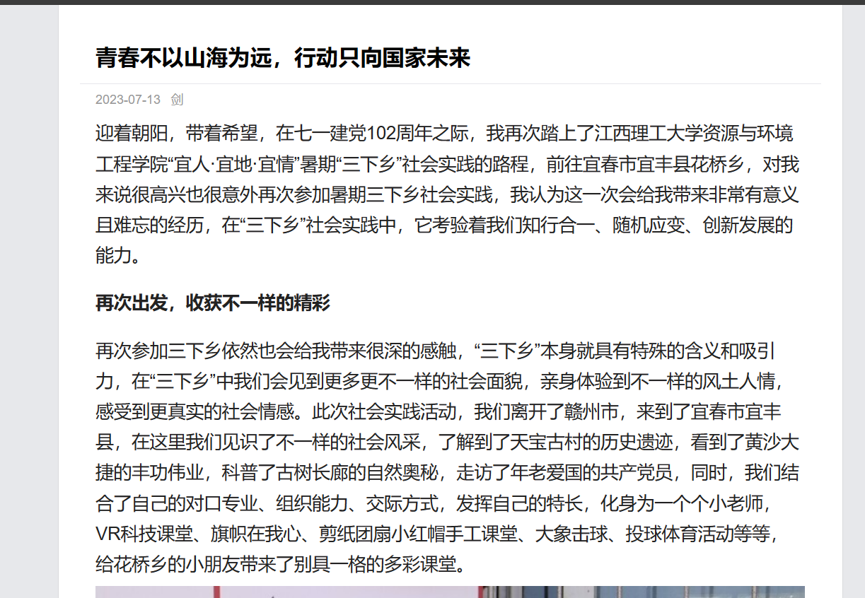 再次参加三下乡依然也会给我带来很深的感触,“三下乡”本身就具有特殊的含义和吸引力,在“三下乡”中我们会见到更多更不一样的社会面貌,亲身体验到不一样的风土人情,感受到更真实的社会情感。此次社会实践活动,我们离开了赣州市,来到了宜春市宜丰县,在这里我们见识了不一样的社会风采,了解到了天宝古村的历史遗迹,看到了黄沙大捷的丰功伟业,科普了古树长廊的自然奥秘,走访了年老爱国的共产党员,同时,我们结合了自己的对口专业、组织能力、交际方式,发挥自己的特长,化身为一个个小老师,VR科技课堂、旗帜在我心、剪纸团扇小红帽手工课堂、大象击球、投球体育活动等等,给花桥乡的小朋友带来了别具一格的多彩课堂。