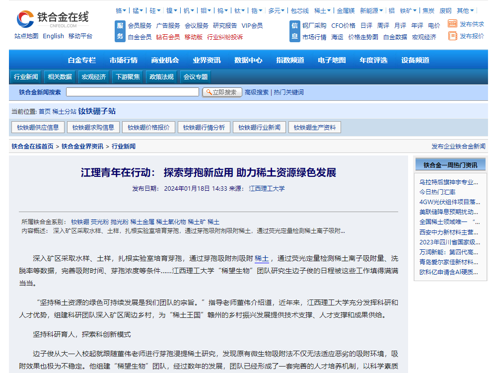 《钛合金在线》:江理学子探索芽孢新应用,助力稀土资源绿色发展