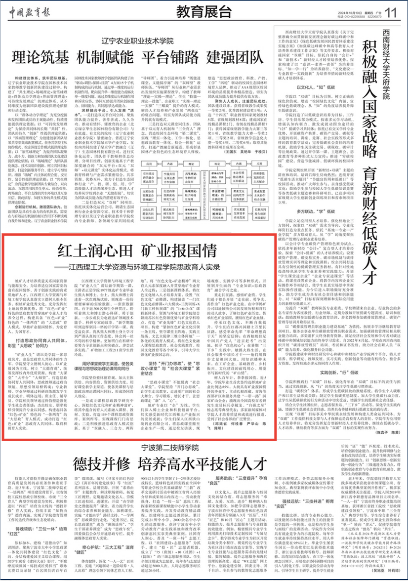 一是成立课程思政教学研究中心,深挖红色文化和矿业精神富矿,将其中蕴含的育人元素融入课程、教材、实验,打造119个课程思政资源库、案例库等,实现课程门门有思政;二是积极推进思政育人模式创新,基于“双融入、三合力、两阵地”,将“红色文化+矿业精神”两大育人元素深度融入并贯穿地矿专业育人全过程;三是创新课程体系,将红色文化纳入人才培养方案,设置“红色文化”必修课,构建涵盖“一门红色文化必修课+六大模块+三类训练+X门新工科拓展课”的“1+6+3+X”课程新体系。资源与环境工程学院结合赣南苏区红色资源优势与矿业学科特点,打造“矿业先锋”红色文化育人项目,构建“紧扣红色矿业文化引领一条主线,坚守课堂主阵地、实践主战场、文艺主旋律三维立体阵地”一体化的实践育人模式,将红色文化融入课程思政教育、社会实践教育、校园文化教育等各个环节,引导大学生强化矿业报国志向。