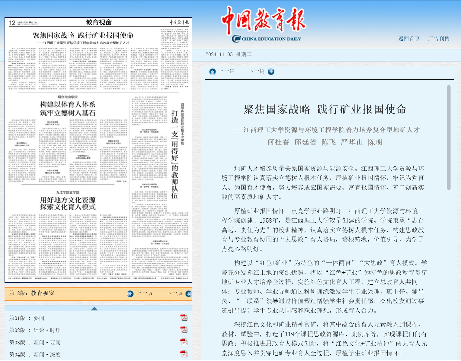构建以“红色+矿业”为特色的“一体两育”“大思政”育人模式。学院充分发挥红土地的资源优势,将以“红色+矿业”为特色的思政教育贯穿地矿专业人才培养全过程,实施红色文化育人工程,建立思政育人共同体:专业教师、学业导师通过科研训练激发学生专业兴趣,班主任、辅导员、“三联系”领导通过价值塑造增强学生社会责任感,杰出校友通过事迹引导提升学生专业认同感和职业理想,形成育人合力。