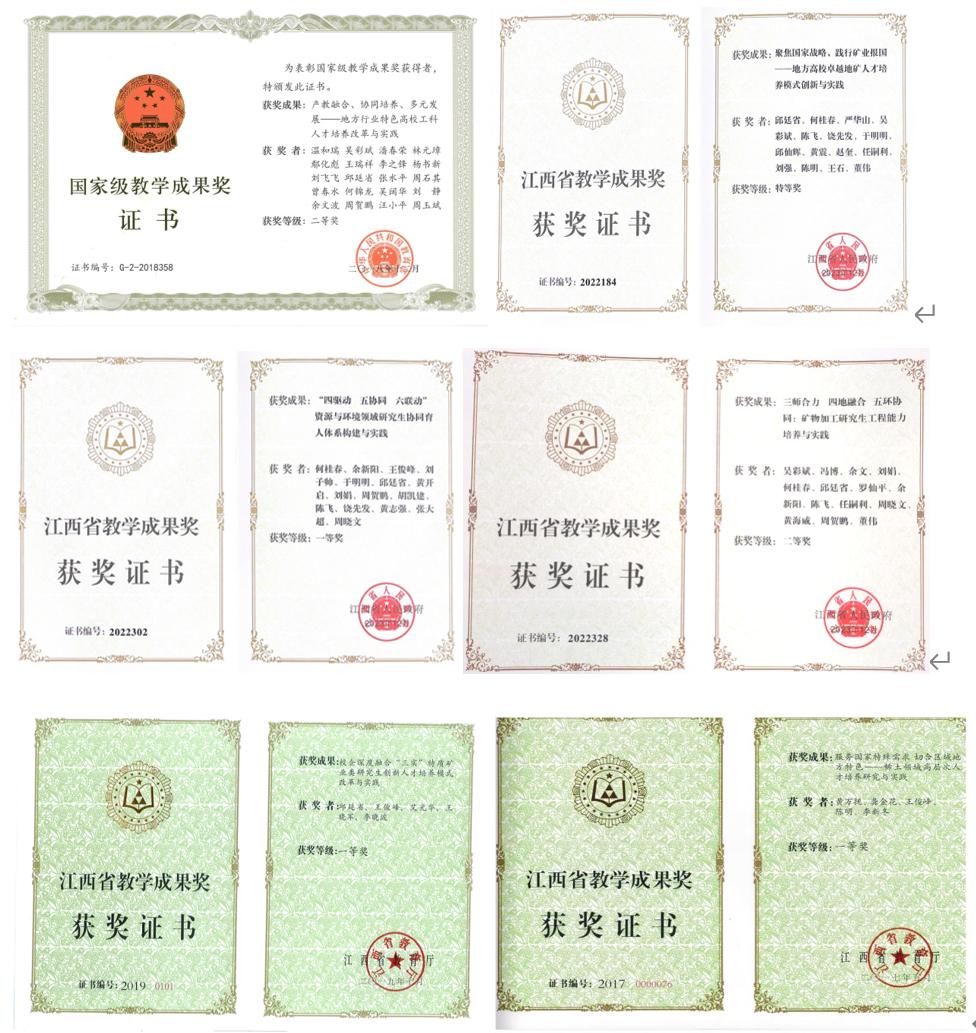 获国家教学成果二等奖、江西省教学成果特等奖等国家/省部级教学奖励10项;指导学生获中国国际“互联网+”创新创业大赛国家金奖/银奖等国家级竞赛奖励47项。代表性教学成果奖如下: