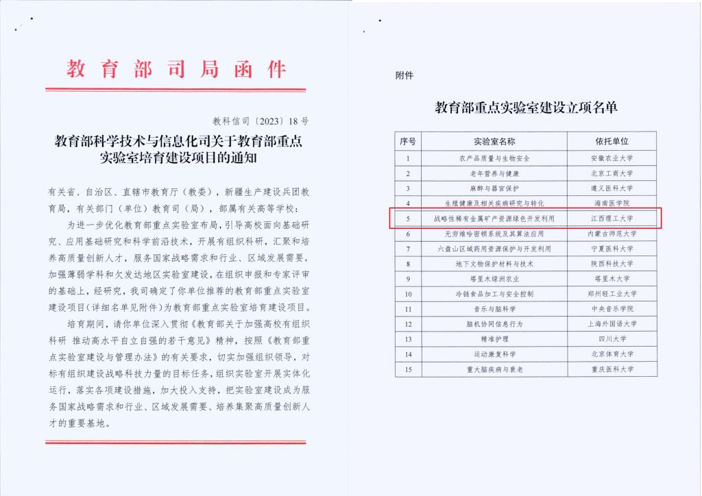 本网讯 近日,教育部科学技术与信息化司发布了《关于教育部重点实验室培育建设项目的通知》(教科信司〔2023〕18号),由我校我院牵头申报的“战略性稀有金属矿产资源绿色开发利用教育部重点实验室”获批教育部重点培育实验室培育建设项目,全国仅15家单位获批组建培育。