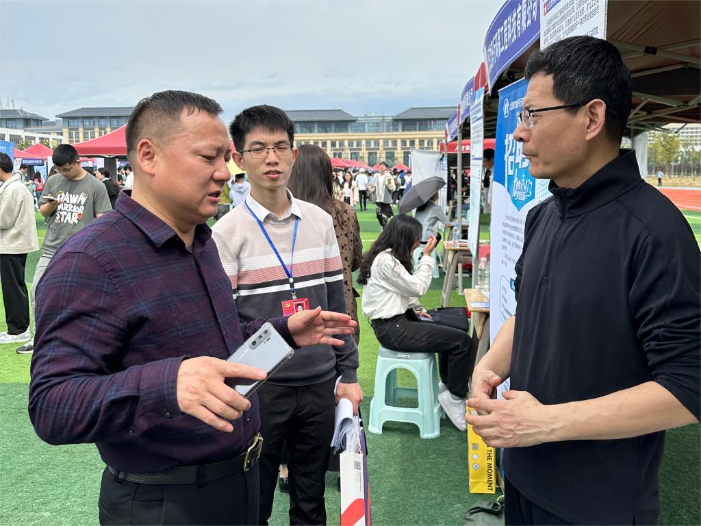 本网讯 3月28日,我校在三江校区举行了2024届毕业生春季就业洽谈会,本次招聘会共吸引了400余家知名企业前来交流洽谈,为即将走出校园的学子们提供了丰富的就业选择。我院党委副书记张春雷、辅导员梁颜祯带队与相关企业进行了深入的交流,并推介学院毕业生。