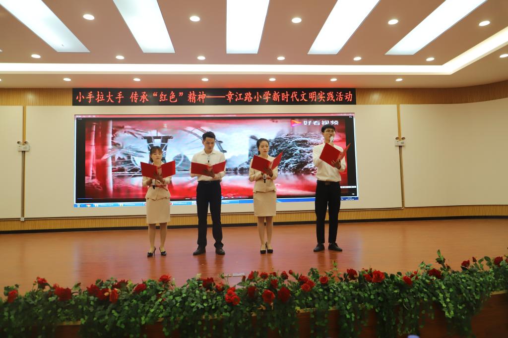 本网讯  4月28日下午,我院大学生红色文化宣讲团走进赣州章江路小学(东校区)开展“红色党史故事浸润孩童心灵”红色主题教育暨新时代文明实践活动。章江路小学(东校区)常务副校长谢芳芸、三年级全体师生以及我院辅导员张小普、大学生红色文化宣讲团成员参加了此次活动。