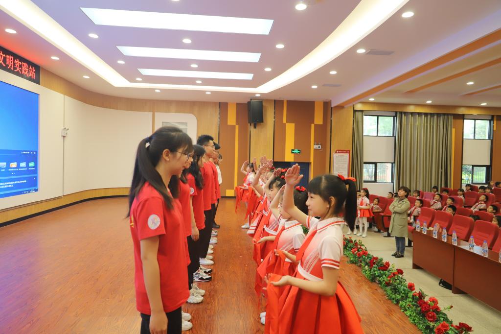 章江路小学(东校区)三年级学生代表为宣讲团成员佩戴红领巾,以此表示对宣讲团成员到来的欢迎,活动在全体起立敬礼、奏唱国歌中有序展开。